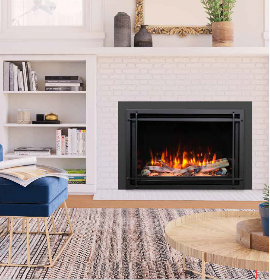 Osseo eSeries Insert Electric Fireplace comes in 2 sizes: 29, & 34. Traditional or birch log set, 7 downlight accent options, 13 glowing ember options and can use Chaska decorative screen fronts.