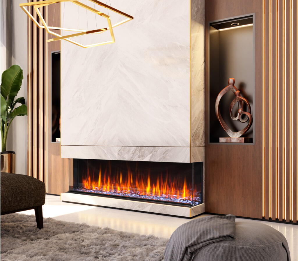 Osseo eSeries Linear Electric Fireplace comes in 3 sizes: 50, 64, & 80. Design options are endless, with convertible front facing, corner (right or left), and panoramic bay appliance options, traditional or birch log set, 7 downlight accent options, and 13 glowing ember options.